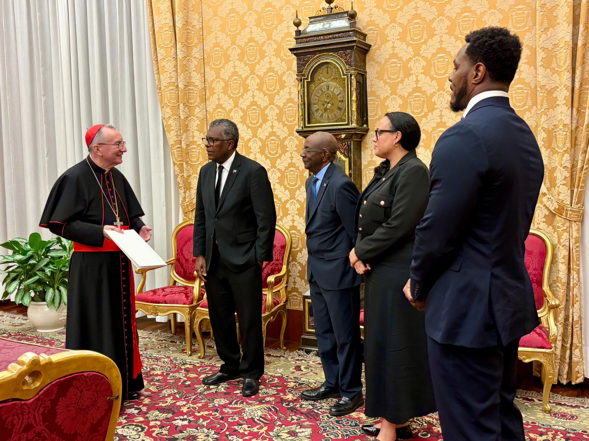 (L-R): Cardinal Parolin, Minister Mitchell; HE Joseph Curry, Ambassador of the Commonwealth of The Bahamas to the Holy See; Kemiko Sands, Vince Council in the High Commission of The Bahamas to the United Kingdom