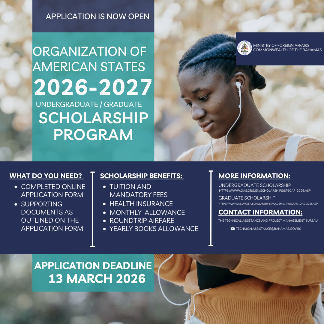 Bahamians pursuing undergraduate and graduate degrees in member states of the Organization of American States are eligible for scholarships. For more details on how to apply, go to www.oas.org/en/scholarships orr see the flyers below: